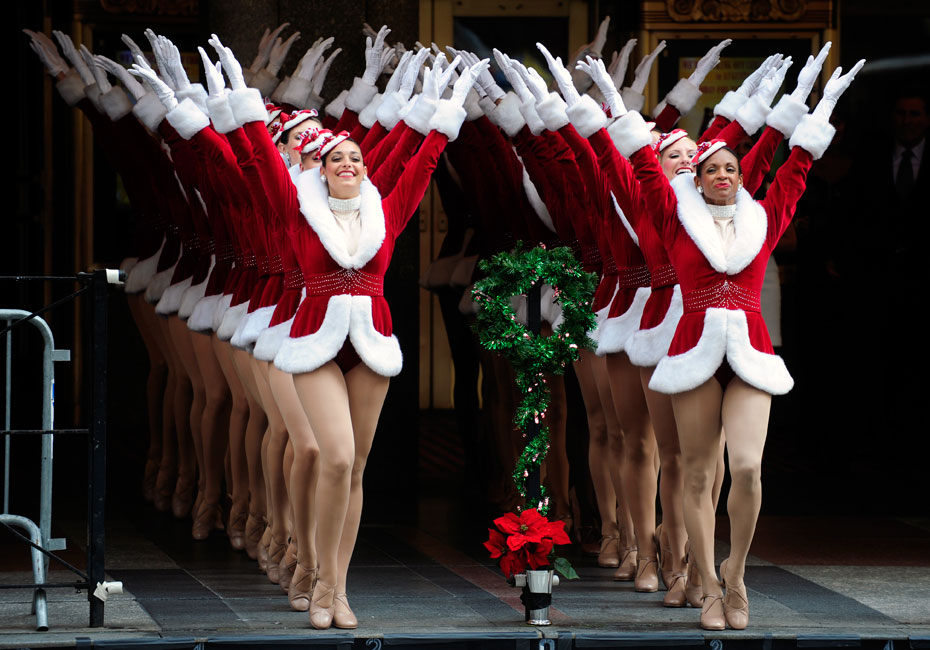 8月25日,美國(guó)“火箭女郎”舞蹈團(tuán)身著圣誕裝在無(wú)線(xiàn)電城音樂(lè)廳(Radio City Music Hall)前演出。來(lái)源:中國(guó)新聞網(wǎng)