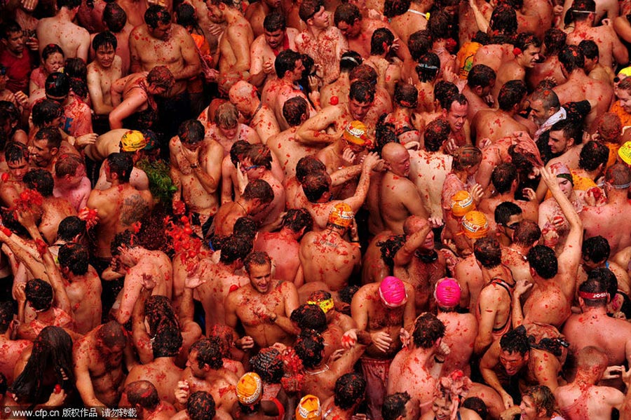 8月26日,西班牙東南部小鎮(zhèn)Bunol當(dāng)日迎來傳統(tǒng)的西紅柿節(jié)。大約4萬名狂歡者在1小時內(nèi)扔掉了11萬公斤西紅柿。來源:中國新聞網(wǎng)