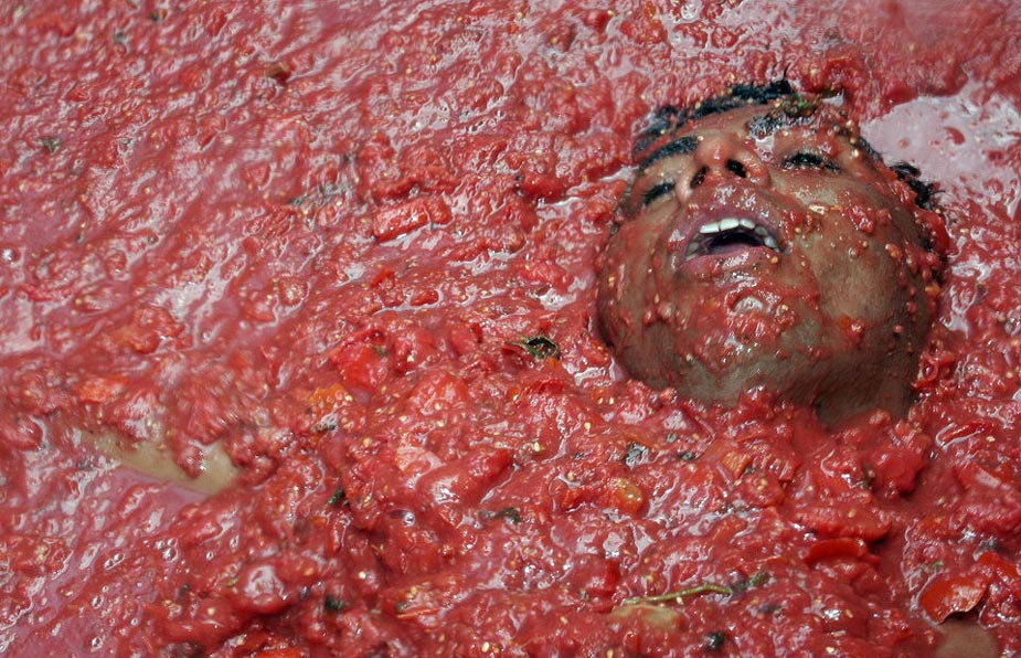 8月26日,西班牙東南部小鎮(zhèn)Bunol當(dāng)日迎來傳統(tǒng)的西紅柿節(jié)。大約4萬名狂歡者在1小時(shí)內(nèi)扔掉了11萬公斤西紅柿。來源:中國新聞網(wǎng)
