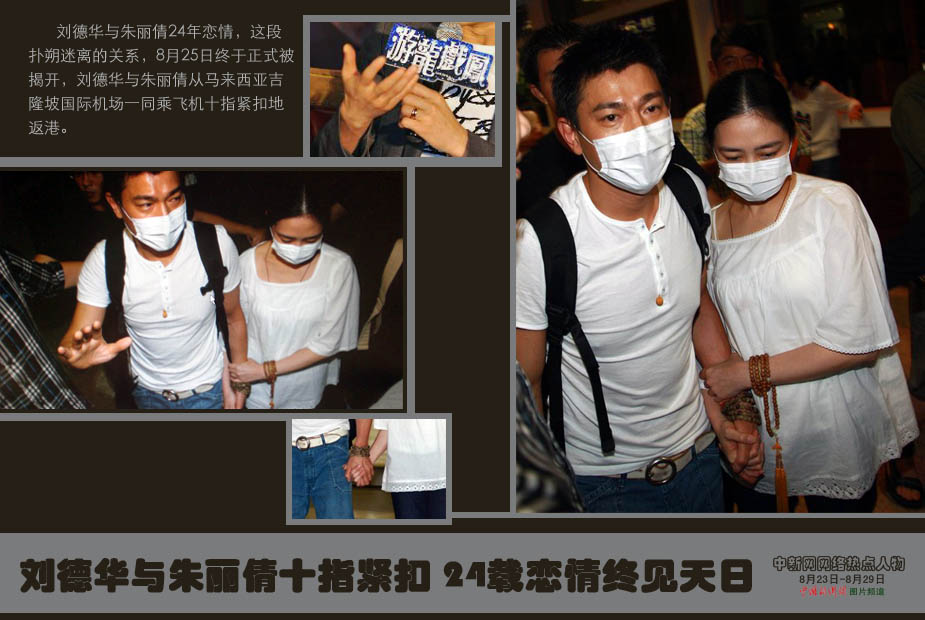 中新網(wǎng)本周熱點(diǎn)人物之——劉德華與朱麗倩 劉德華與朱麗倩24年戀情,這段撲朔迷離的關(guān)系,8月25日終于正式被揭開,兩人繼日前結(jié)伴到岳父墓前拜祭后,劉德華與朱麗倩從馬來西亞吉隆坡國(guó)際機(jī)場(chǎng)一同乘飛機(jī)十指緊扣地返港。
