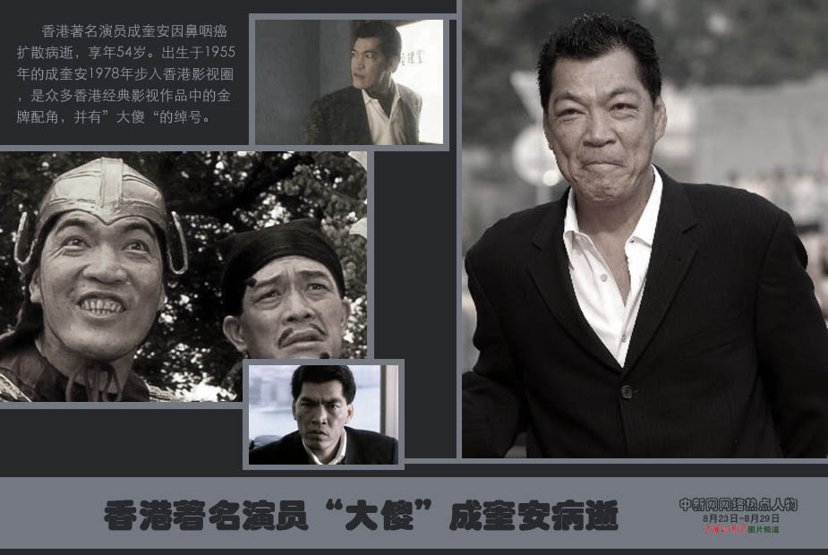 中新網(wǎng)本周熱點(diǎn)人物之——成奎安 北京時(shí)間27日晚23時(shí)45分,香港著名演員成奎安因鼻咽癌擴(kuò)散病逝,享年54歲。出生于1955年的成奎安1978年步入香港影視圈,是眾多香港經(jīng)典影視作品中的金牌配角,并有”大傻“的綽號。