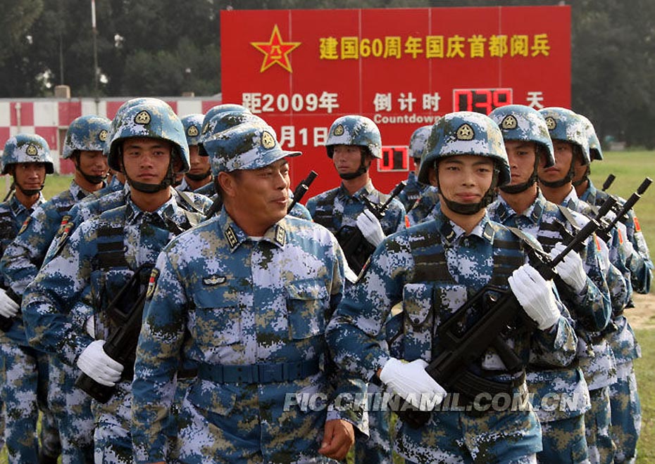 9月3日,解放軍官兵在位于北京郊區(qū)的一處徒步方隊閱兵村內(nèi)訓(xùn)練。今年國慶節(jié)將舉行新中國成立60周年國慶首都盛大閱兵儀式。來源:中國軍網(wǎng)