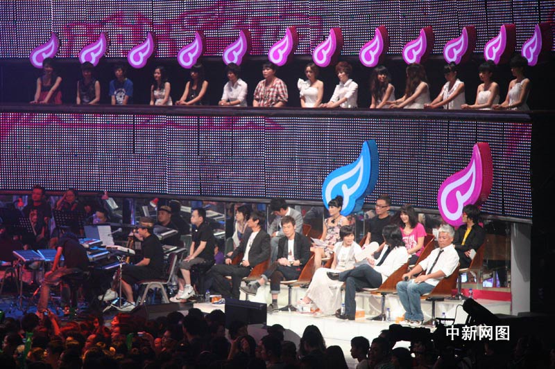 9月4日,湖南衛(wèi)視“2009快樂女聲”進(jìn)行最后的總決賽。江映蓉、黃英、李霄云這3強(qiáng)選手將通過18首歌曲的演繹,向全國總冠軍發(fā)起最后沖擊。圖為現(xiàn)場的評審。劉雙雙攝