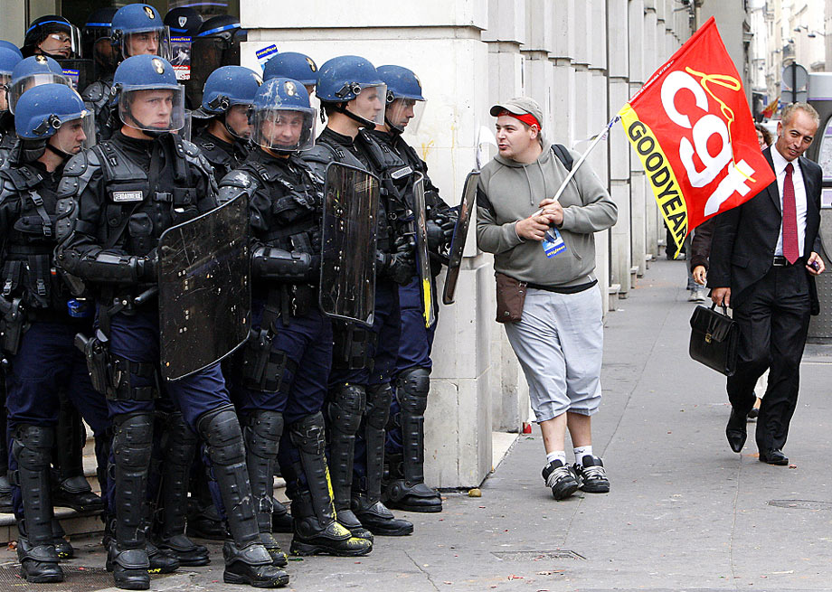 9月17日,在巴黎的金融市場(chǎng)管理局總部前,一名固特異公司雇員與保衛(wèi)總部大樓的防暴警察面對(duì)面。當(dāng)天,數(shù)百人舉行抗議反對(duì)汽車制造業(yè)裁員和重組。圖片來(lái)源:中國(guó)新聞網(wǎng)