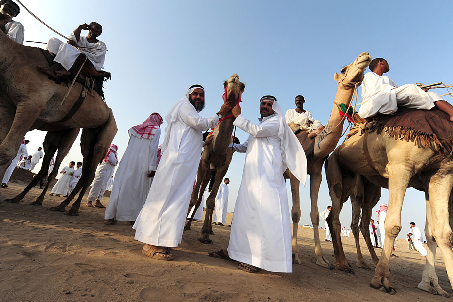 9月25日,在沙特阿拉伯東部的哈利斯,駱駝騎士們騎著自己的座駕在大漠中飛馳。圖片來源:中國(guó)新聞網(wǎng)