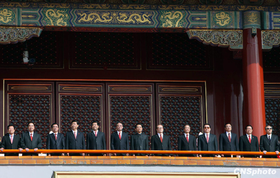 2009年10月1日,中華人民共和國(guó)成立60周年慶祝大會(huì)在北京天安門廣場(chǎng)舉行。圖為胡錦濤等黨和國(guó)家領(lǐng)導(dǎo)人在天安門城樓上閱兵。中新社發(fā) 杜洋 攝