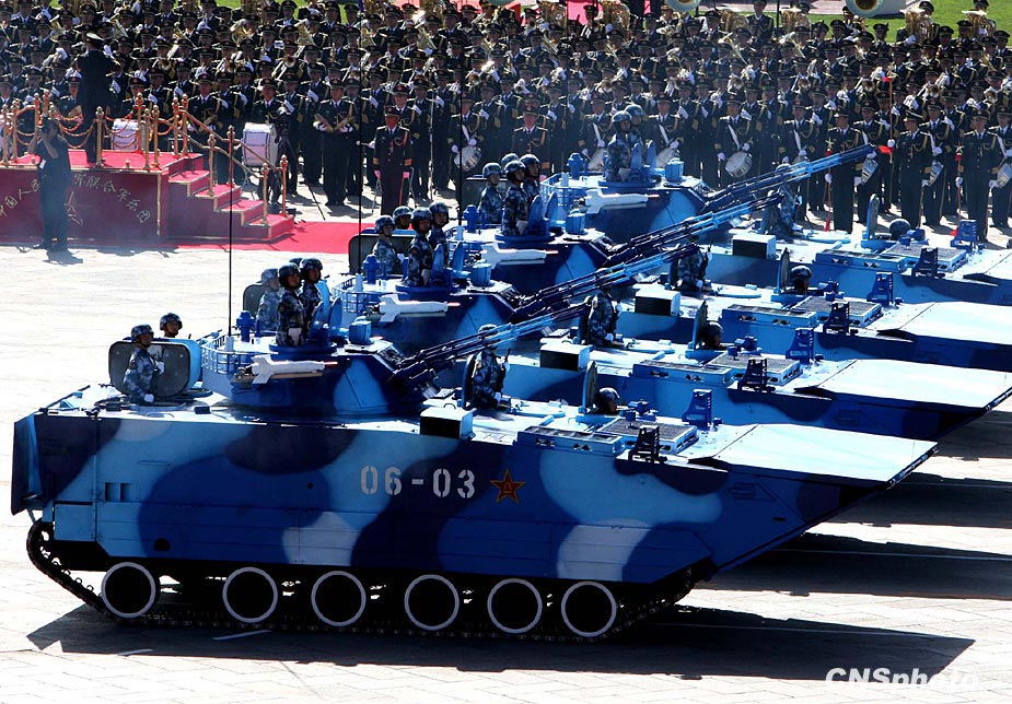 10月1日,中華人民共和國(guó)成立60周年慶祝大會(huì)在北京天安門(mén)地區(qū)及長(zhǎng)安街沿線舉行。圖為海軍05式兩棲步戰(zhàn)車(chē)方隊(duì)通過(guò)天安門(mén)廣場(chǎng)。首次亮相的05式兩棲步戰(zhàn)車(chē)是海軍陸戰(zhàn)隊(duì)新一代主戰(zhàn)裝備,信息化程度較高,安裝了先進(jìn)的火控系統(tǒng)、衛(wèi)星定位系統(tǒng)、夜視系統(tǒng)、一體化通訊系統(tǒng)等。同時(shí),步戰(zhàn)車(chē)火力系統(tǒng)得到全面提升,裝備了反坦克導(dǎo)彈、速射炮和高射機(jī)槍?zhuān)苡行?yīng)對(duì)來(lái)自坦克和直升機(jī)的威脅。中新社發(fā) 任晨鳴 攝