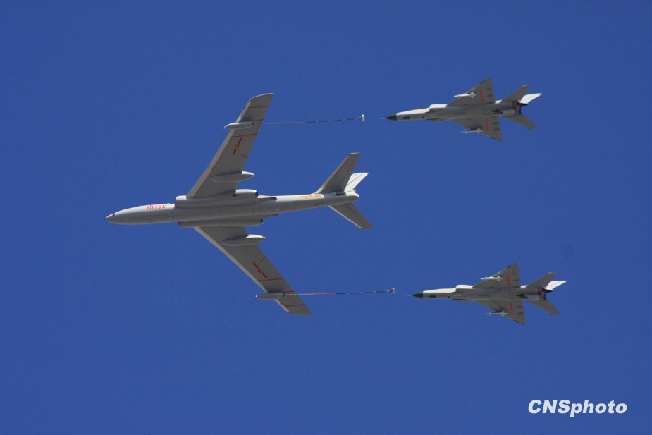 2009年10月1日,中華人民共和國成立60周年慶祝大會在北京天安門廣場舉行。圖為加受油機梯隊通過天安門廣場上空。中新社發(fā) 郭國權 攝