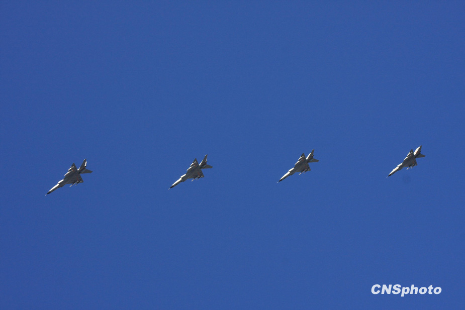 2009年10月1日,中華人民共和國成立60周年慶祝大會在北京天安門廣場舉行。圖為殲擊機(jī)梯隊(duì)飛過天安門廣場上空。中新社發(fā) 郭國權(quán) 攝