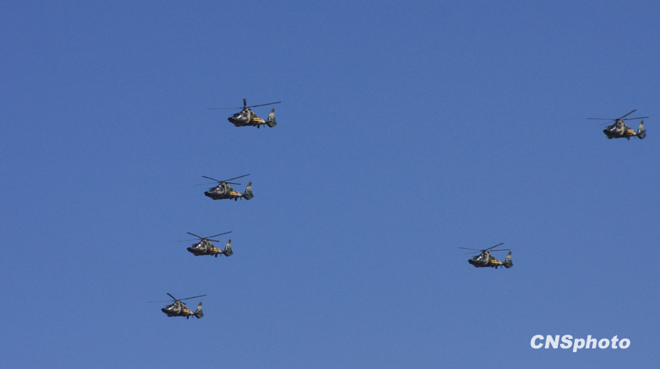 2009年10月1日,中華人民共和國成立60周年慶祝大會在北京天安門廣場舉行。圖為武裝直升機梯隊飛過天安門廣場上空。中新社發(fā) 郭國權 攝