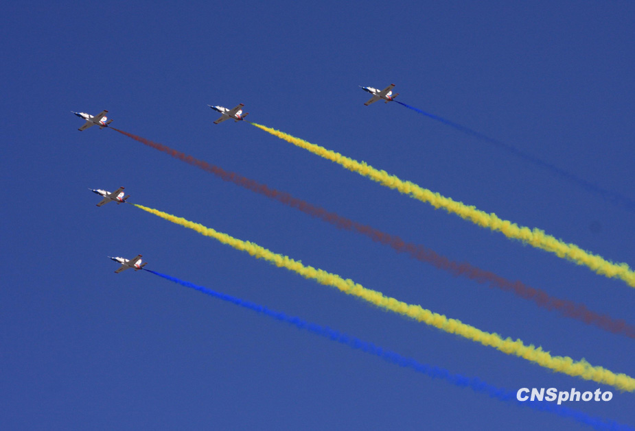 2009年10月1日,中華人民共和國(guó)成立60周年慶祝大會(huì)在北京天安門(mén)廣場(chǎng)舉行。圖為教練機(jī)梯隊(duì)飛過(guò)天安門(mén)廣場(chǎng)上空。中新社發(fā) 郭國(guó)權(quán) 攝