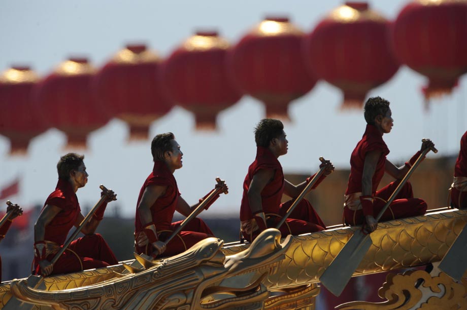 10月1日,首都各界慶祝中華人民共和國成立60周年大會在北京舉行。圖為彩車上的演員。中新社發(fā) 廖攀 攝
