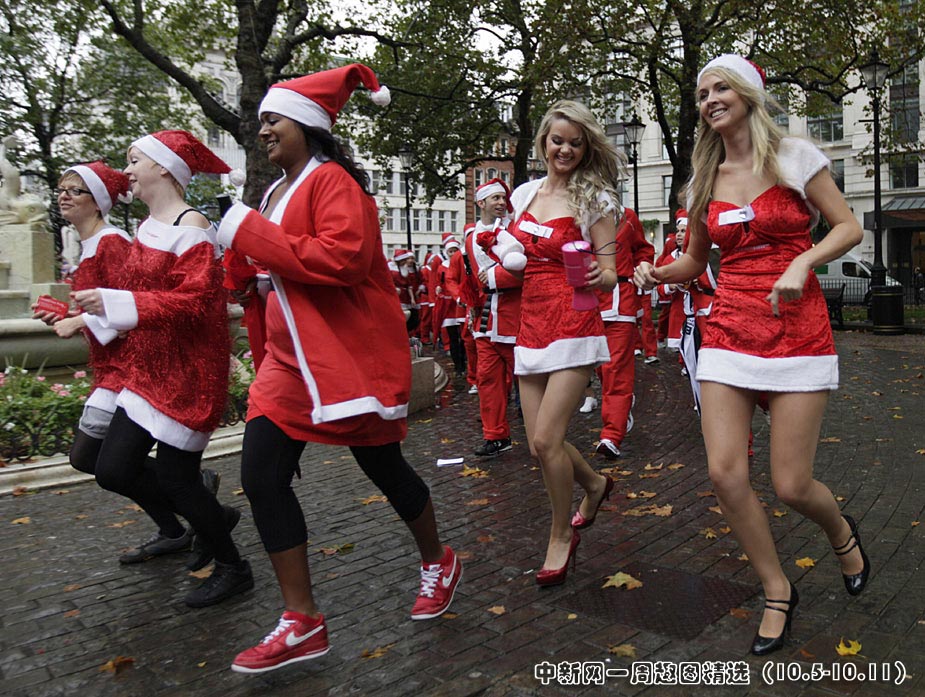 10月6日,英國倫敦市中心100多位圣誕老人為籌集乳腺癌護理善款而參加歡樂跑活動。來源:中國新聞網(wǎng)