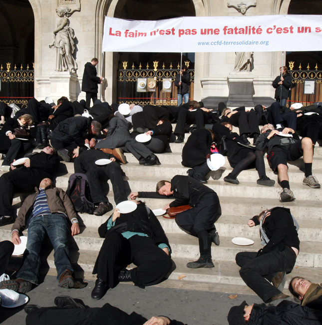 10月15日,示威者身穿黑色衣服、手持空盤子在巴黎歌劇院前抗議。他們此舉是為了呼吁人們關(guān)注世界上的饑民。圖片來源:中國新聞網(wǎng)