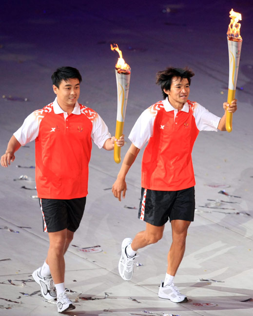 十月十六日晚,中華人民共和國(guó)第十一屆運(yùn)動(dòng)會(huì)在山東濟(jì)南奧體中心隆重開(kāi)幕。王皓、香港運(yùn)動(dòng)員黃金寶(右)與眾火炬手一起點(diǎn)燃全運(yùn)圣火。中新社發(fā) 湯彥俊 攝