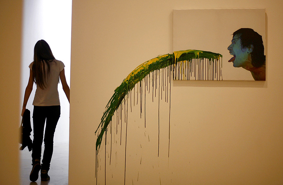 周日(10月11日),塞爾維亞貝爾格萊德舉行的十月藝術沙龍展上,一名參觀者走過一幅藝術作品。圖片來源:中國新聞網(wǎng)