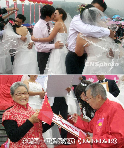 10月12日,享有“萬里長(zhǎng)江第一城”美譽(yù)的四川省宜賓市在長(zhǎng)江、金沙江、岷江接合部舉行“盛世中華”集體婚典。圖片來源:中國新聞網(wǎng)