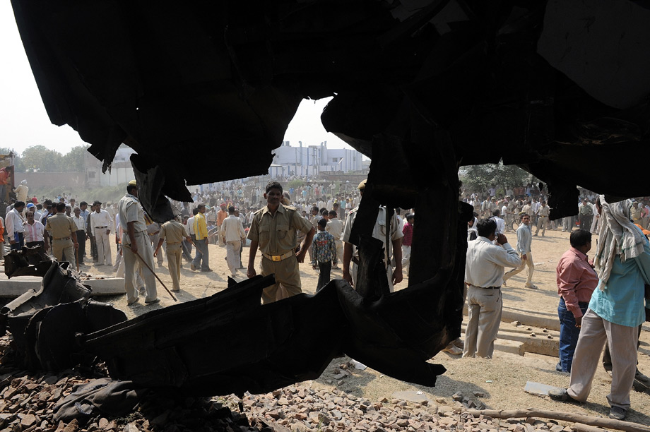 印度北方邦21日凌晨發(fā)生兩列火車相撞事故, 一輛來自西南部果阿的快運列車在馬圖拉附近與一列來自西部拉賈斯坦邦梅瓦爾的快運列車相撞,造成15人死亡。圖為印度鐵路部門工作人員在馬圖拉郊區(qū)查看火車相撞事故現(xiàn)場。來源:中國新聞網(wǎng)