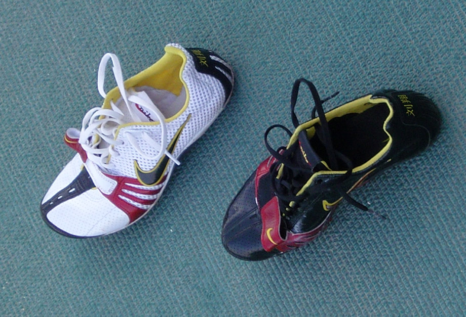 劉翔今天穿了一雙印有他名字的釘鞋,他左腳穿的是白色的新鞋,右腳的黑鞋是相對軟一些、舒適一些的的舊鞋,有利于保護他的傷腳。中新網(wǎng)記者 翁陽 攝