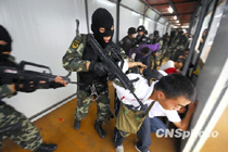 10月23日下午3時(shí)40分,推進(jìn)“平安重慶”建設(shè)突發(fā)事件應(yīng)急演練在該市渝中區(qū)大田灣體育場(chǎng)舉行,重慶各警種突精銳力量重裝登場(chǎng),將各類事件一一化解。圖為反劫持戰(zhàn)術(shù)演練中,武警特種作戰(zhàn)分隊(duì)、特警總隊(duì)突擊分隊(duì)發(fā)起攻擊,一舉捕殲了“恐怖分子”。 中新社發(fā) 郝飛 攝