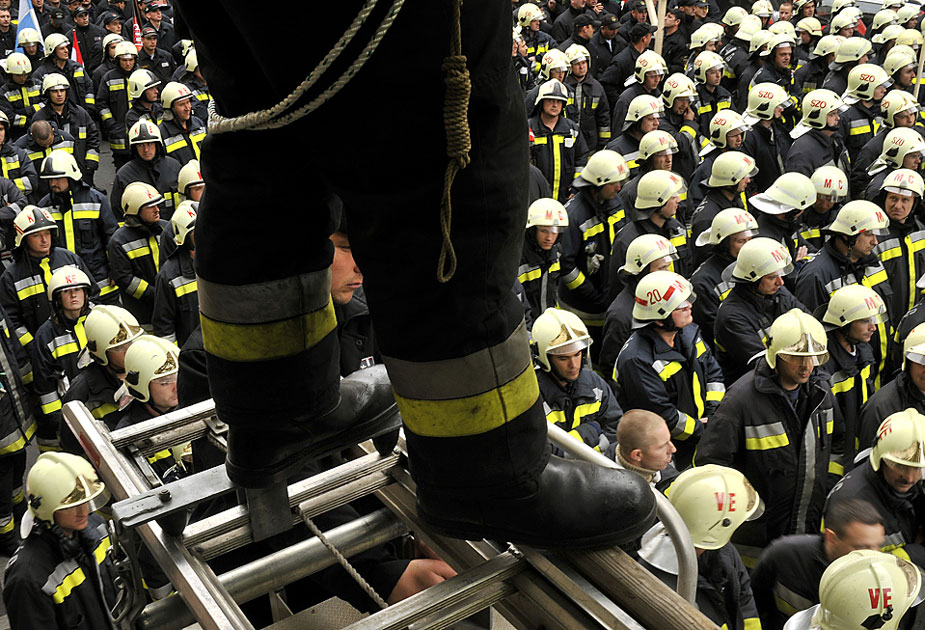 周一(19日),布達佩斯,數千名消防員在為獲得更高的工資進行抗議活動。 來源:中國新聞網
