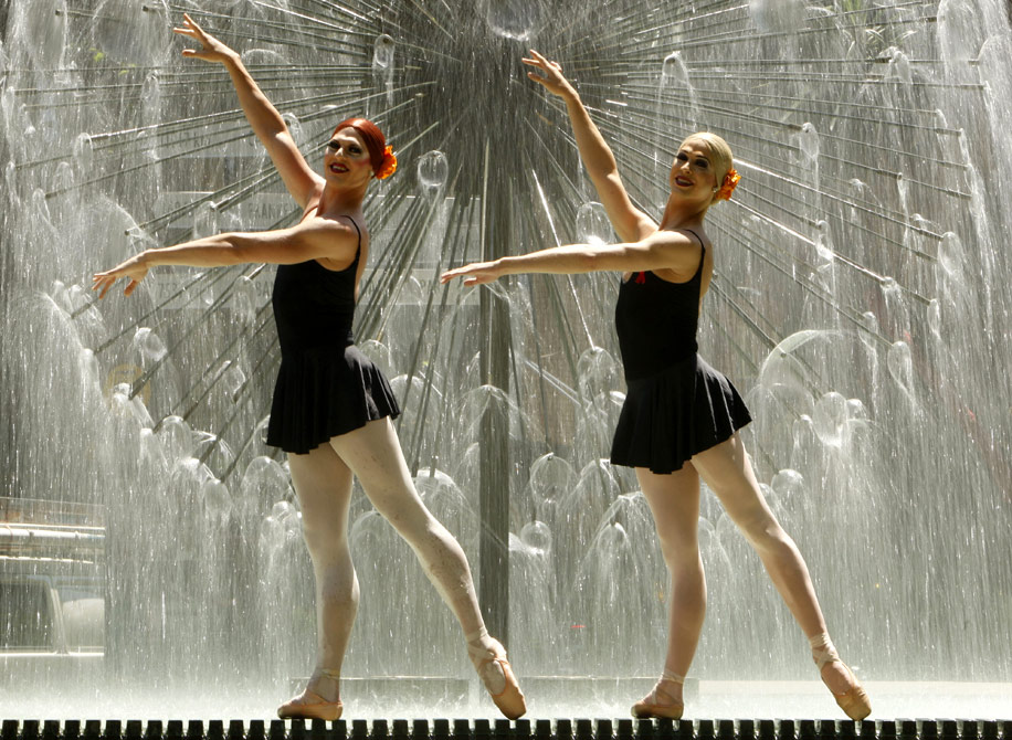 2009年10月23日,澳大利亞悉尼,來自紐約的全男班惹笑芭蕾舞團(tuán)The Trocks在噴泉邊起舞。高超的足尖技巧,優(yōu)美的芭蕾舞姿,加上怪異的動(dòng)作滑稽的表情,這些美國男子芭蕾演員們用一種另類的表現(xiàn)力顛覆了人們心中優(yōu)雅高貴的印象,讓觀眾欣賞傳統(tǒng)以外的男扮女裝芭蕾舞表演。