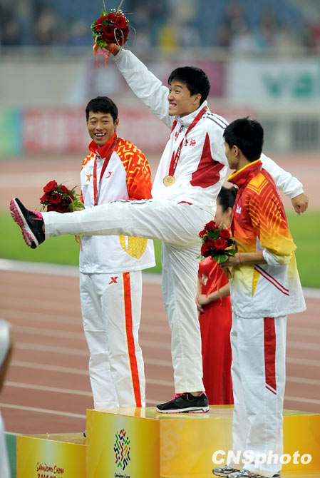 10月25日,在全運(yùn)會田徑男子110米欄決賽中,上海代表團(tuán)選手、“中國飛人”劉翔以13秒34的成績勇奪冠軍,同時(shí)也成就了其全運(yùn)會該項(xiàng)目三連冠的偉業(yè)。