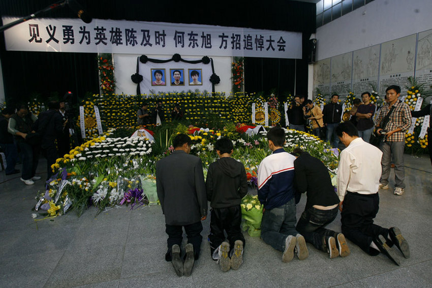 10月28日上午,湖北荊州市在市殯儀館舉行隆重追悼大會(huì),悼念陳及時(shí)、何東旭、方招三位舍己救人大學(xué)生。數(shù)萬群眾趕到追悼會(huì)現(xiàn)場,手捧菊花為英雄道別。