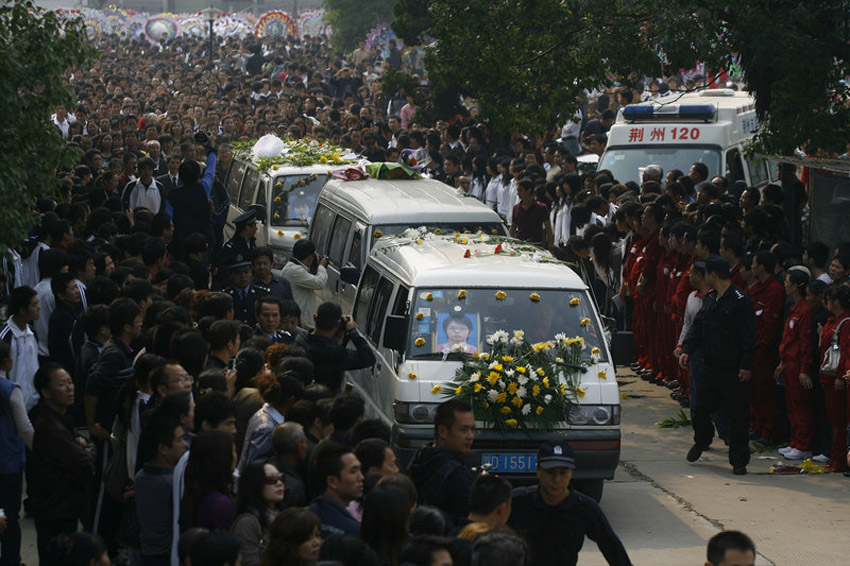 10月28日上午,湖北荊州市在市殯儀館舉行隆重追悼大會,悼念陳及時(shí)、何東旭、方招三位舍己救人大學(xué)生。數(shù)萬群眾趕到追悼會現(xiàn)場,手捧菊花為英雄道別。