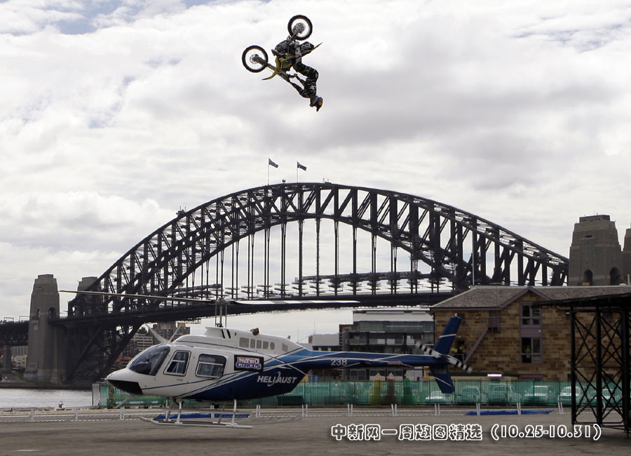 10月28日,在澳大利亞悉尼著名的港灣大橋附近,美國人特拉維斯·帕斯切拉駕駛摩托車成功從一架盤旋的直升機(jī)上空飛過。特拉維斯是一位著名的極限運(yùn)動玩家,此次是為一個電視節(jié)目做推廣。>>點(diǎn)擊觀看詳細(xì)內(nèi)容