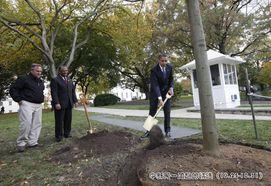 10月28日,美國(guó)華盛頓,總統(tǒng)奧巴馬在白宮北草坪上植樹(shù)。前總統(tǒng)布什曾于2008年4月在同樣的位置種下一棵樹(shù),但未能成活。>>點(diǎn)擊觀看詳細(xì)內(nèi)容