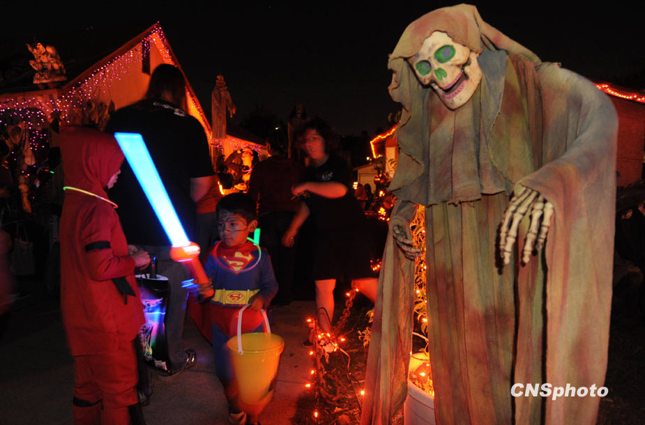 10月31日是西方的“萬圣節(jié)”,世界各地的群眾穿著奇異的服飾、打扮鬼魅的造型迎接“鬼節(jié)”的到來。圖為洛杉磯兒童享受“萬圣節(jié)之夜”的樂趣。 中新社發(fā) 張煒 攝