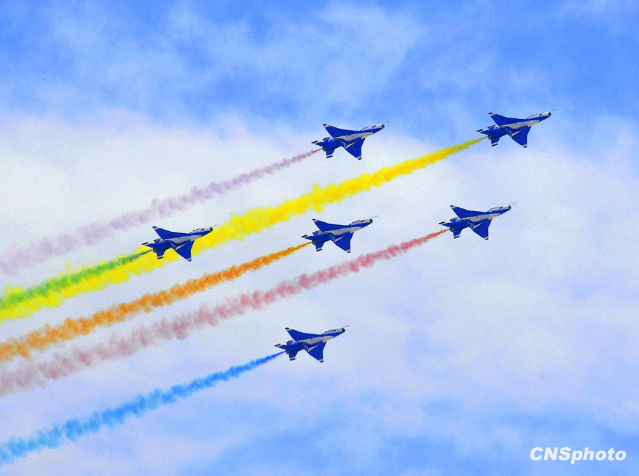 十一月三日,為迎接十一月十一日中國(guó)人民解放軍空軍建軍六十周年,空軍八一飛行表演隊(duì)和空軍八一跳傘隊(duì)在北京沙河機(jī)場(chǎng)舉行了精彩的預(yù)演。圖為殲七戰(zhàn)機(jī)方隊(duì)。 中新社發(fā) 潘旭臨 攝