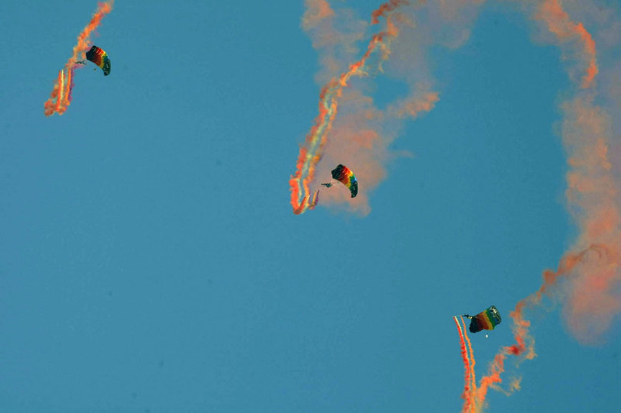 11月3日上午,慶?哲娊ㄜ60周年空中表演在沙河機(jī)場舉行首場預(yù)演。八一跳傘隊(duì)共有24名隊(duì)員表演開路先鋒、空中彩虹、歡慶盛典和仙女下凡4個(gè)節(jié)目。黑克 張穎川 攝