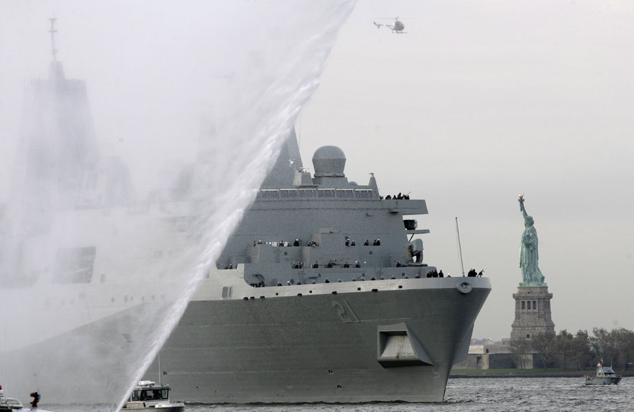 周一(2日),由紐約世界貿(mào)易中心廢鋼建成的美國(guó)軍艦駛過(guò)自由女神像。來(lái)源:中國(guó)新聞網(wǎng)