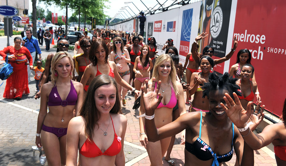 11月7日,南非女性著比基尼沿著梅爾羅斯門大道游行了1690米,在打破吉尼斯世界記錄的同時提醒婦女提高防范乳腺癌的意識。圖片來源:中國新聞網(wǎng)