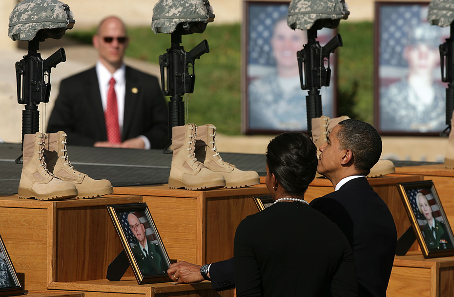 2009年11月10日,美國(guó)德克薩斯州胡德堡陸軍基地舉行儀式悼念槍擊案遇難者。美國(guó)總統(tǒng)奧巴馬和第一夫人米歇爾出席。 圖片來(lái)源:中國(guó)新聞網(wǎng)