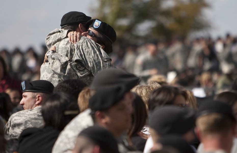 2009年11月10日,在美國得克薩斯州胡德堡陸軍基地,士兵在悼念儀式上哭泣。當(dāng)日,美國德克薩斯州胡德堡陸軍基地舉行儀式悼念槍擊案遇難者。 圖片來源:中國新聞網(wǎng)