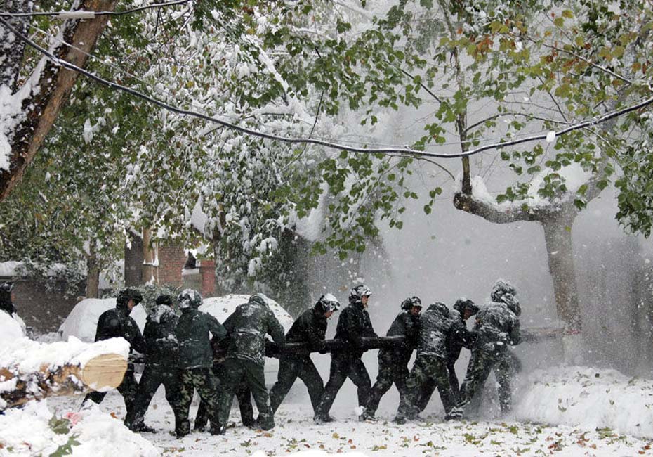 11月11日,石家莊,部隊(duì)官兵采用木棍撞擊樹(shù)上積壓的雪。