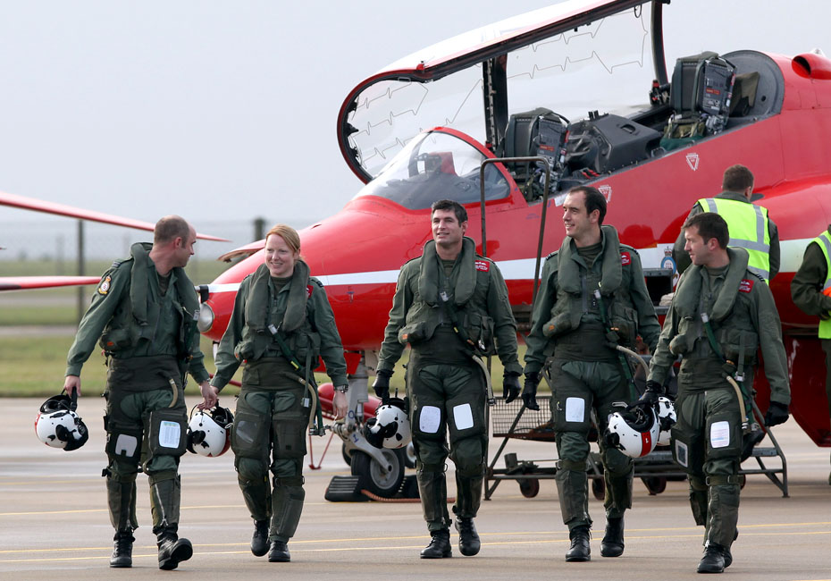 圖為紅箭飛行表演隊(duì)首位女飛行員基絲·摩爾與隊(duì)友。