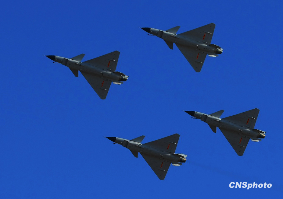 慶祝中國人民解放軍空軍成立60周年飛行表演,11月15日上午在北京沙河機場舉行。表演按八一飛行表演隊4架殲-10飛機表演12個動作和6架殲-7GB飛機表演15個動作,分四機對頭交叉、四機菱形隊大坡度盤旋、單機小速度平飛等27個動作,其中四機對頭交叉動作是這次表演中技術(shù)難度較大的動作之一,這是國產(chǎn)三代飛機和國產(chǎn)二代飛機首次同場競技表演。圖為八一飛行隊殲-10進行表演。中新社發(fā) 宋吉河 攝