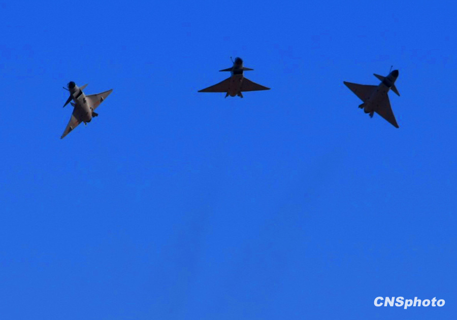 慶祝中國人民解放軍空軍成立60周年飛行表演,11月15日上午在北京沙河機場舉行。表演按八一飛行表演隊4架殲-10飛機表演12個動作和6架殲-7GB飛機表演15個動作,分四機對頭交叉、四機菱形隊大坡度盤旋、單機小速度平飛等27個動作,其中四機對頭交叉動作是這次表演中技術(shù)難度較大的動作之一,這是國產(chǎn)三代飛機和國產(chǎn)二代飛機首次同場競技表演。圖為八一飛行隊殲-10表演三機箭隊水平向上開花。中新社發(fā) 宋吉河 攝