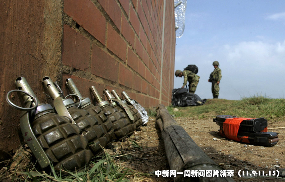 10日(周二),被反叛人員殺死的哥倫比亞士兵的手雷擺放在墻角。圖片來源:中國新聞網(wǎng)