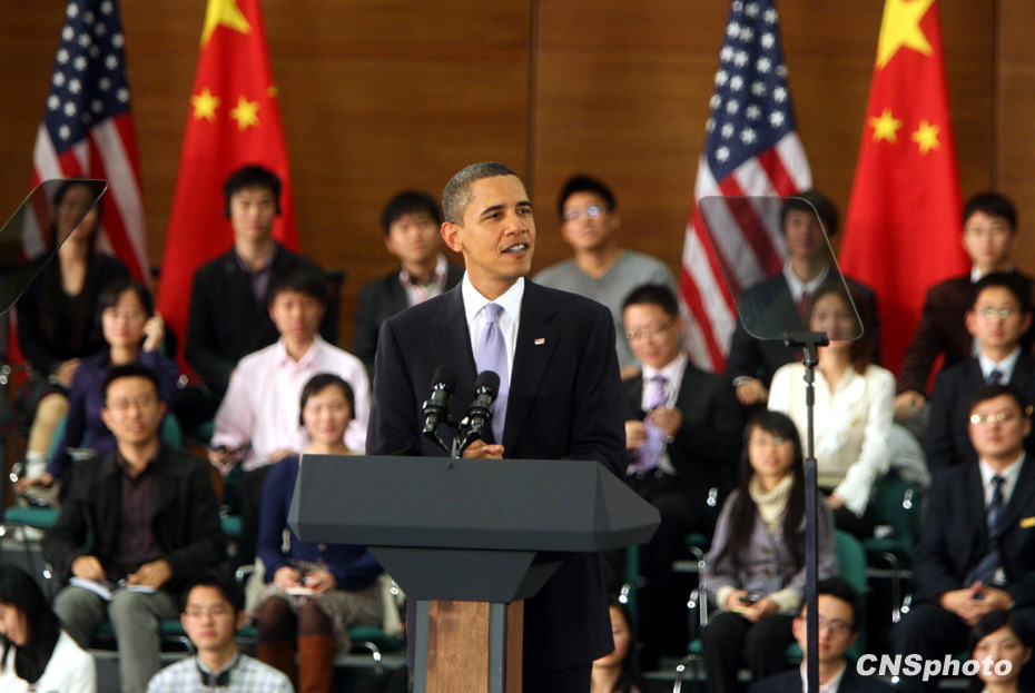 11月16日,正在上海訪問的美國總統(tǒng)奧巴馬現(xiàn)身位于浦東的上海科技館,與四百余中國青年進(jìn)行面對面交流。 中新社發(fā) 湯彥俊 攝