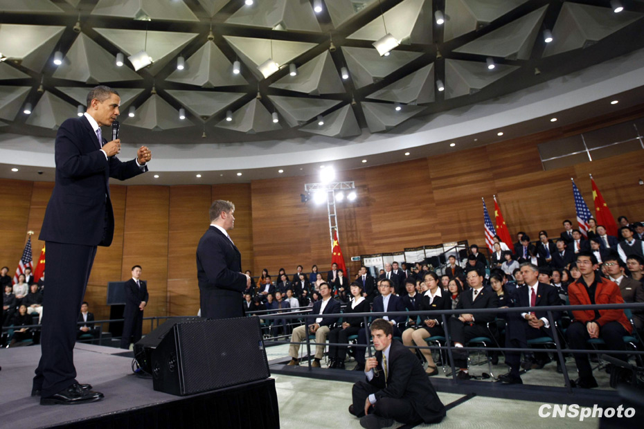 11月16日,正在中國進(jìn)行國事訪問的美國總統(tǒng)奧巴馬,在上海就與中國青年交流,并現(xiàn)場回答提問。中新社發(fā) 盛佳鵬 攝