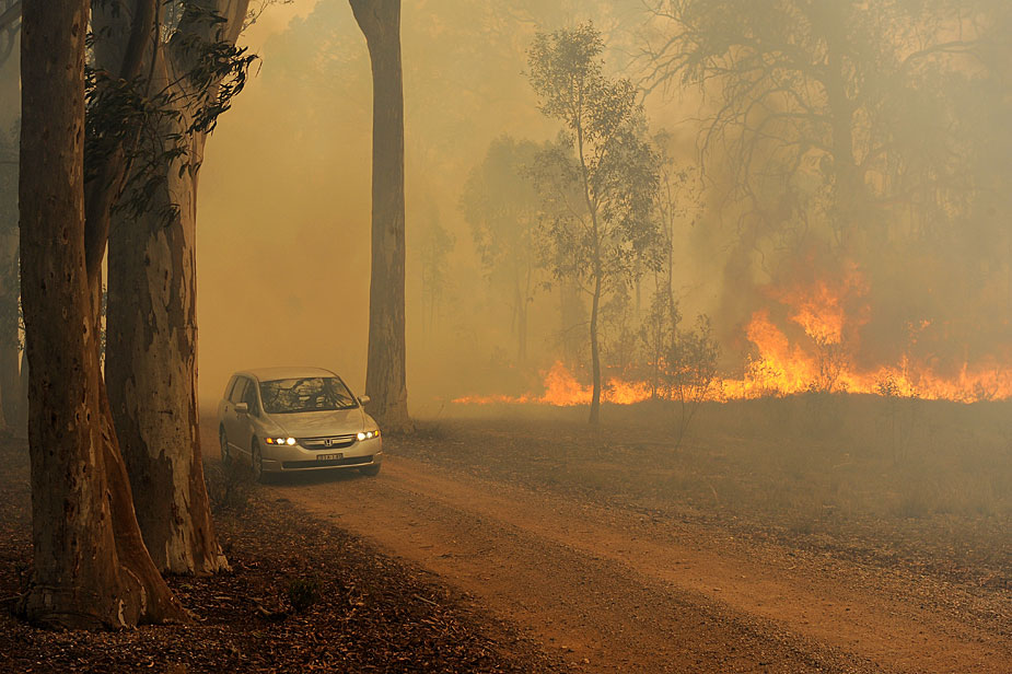 11月22日,澳大利亞東部悉尼西北部地區(qū)因高溫發(fā)生森林大火,當(dāng)?shù)鼐用癖黄瘸冯x。圖片來源:中國新聞網(wǎng)