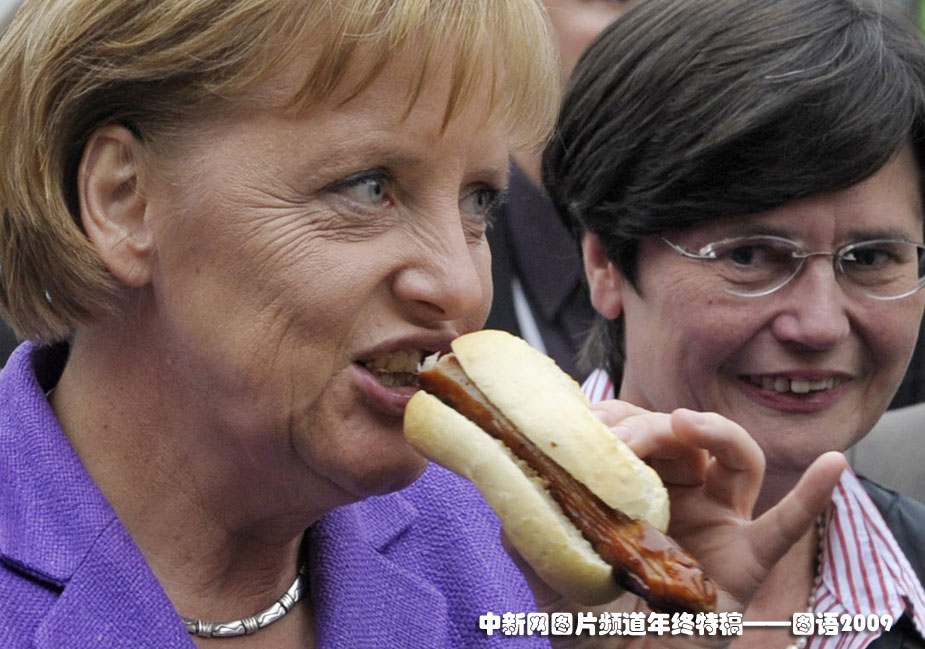 美食的誘惑:2009年9月27日,德國(guó)總理默克爾在德國(guó)東部愛(ài)爾福特市訪問(wèn)時(shí),大吃香腸。