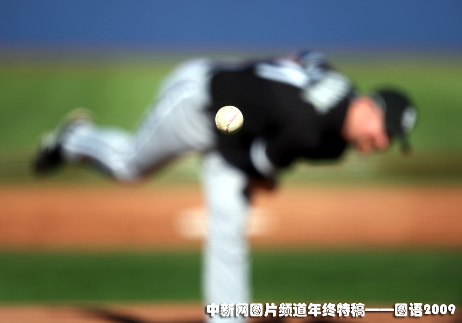 美國棒球聯(lián)賽上,投手將球投出的瞬間。
