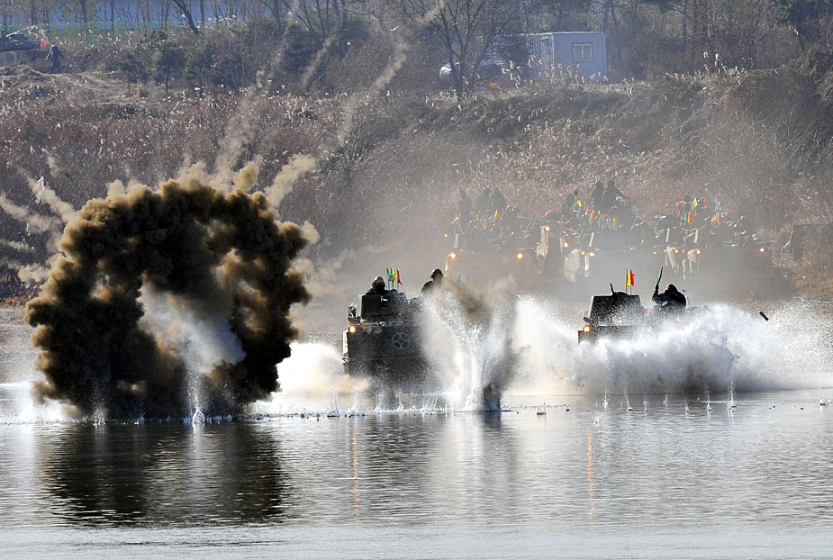 12月16日,韓國(guó)第20師團(tuán)機(jī)械化部隊(duì)在京畿道驪州南漢江一帶進(jìn)行大規(guī)模渡河實(shí)戰(zhàn)訓(xùn)練。該訓(xùn)練以培養(yǎng)戰(zhàn)斗執(zhí)行能力為重點(diǎn)。圖片來源:中國(guó)新聞網(wǎng)