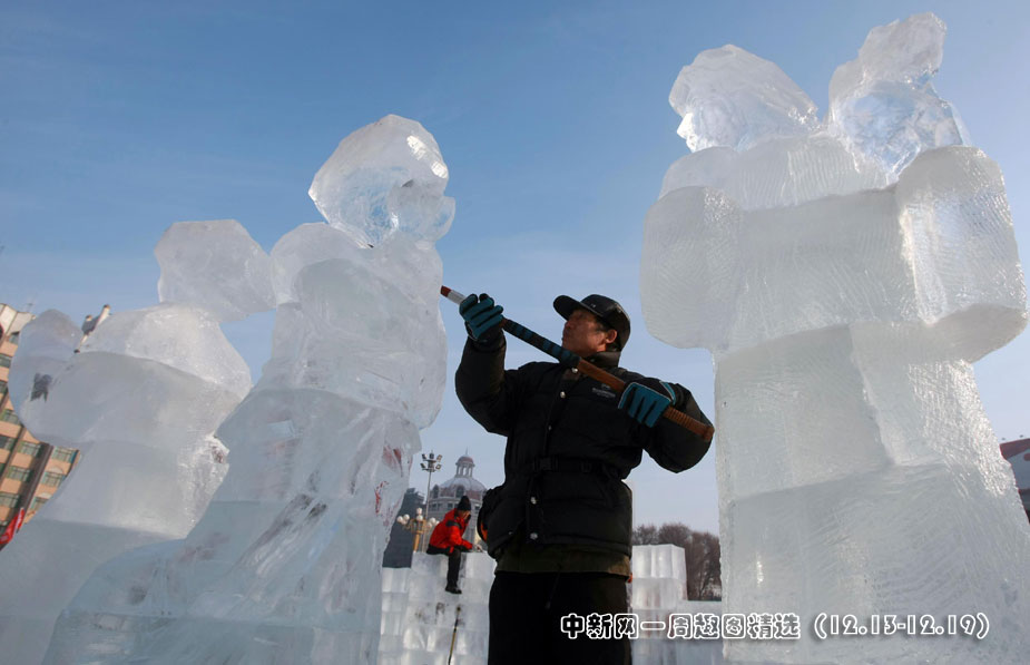 12月16日,新疆烏魯木齊市人民廣場,兩位冰雕師傅正在抓緊時(shí)間雕刻一組表現(xiàn)新疆少數(shù)民族風(fēng)情的大型冰雕作品。圖片來源:中國新聞網(wǎng)>>點(diǎn)擊觀看詳細(xì)內(nèi)容